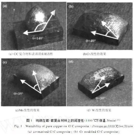 ITER分流裝置中的熱管為了具備高強度和高導熱性,通常是由最外層碳/碳復合材料包覆著銅合金。Pietro1 Appendino通過對碳/碳復合材料表面改性,直接將銅澆鑄在表面。他認為,選用的ⅥB元素(如Mo,W,Cr)很容易與碳生成碳化物,而這些類似金屬的碳化物易于被熔化的銅所潤濕;各元素對復合材料表面改性后,銅的潤濕效果也不同(圖1)。