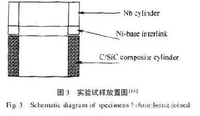 為了得到使用溫度較高的連接件,以滿足碳纖維材料的應用需求,童巧英等人采用一種熔點較高的Ni基連接劑作中間層,用液相滲透方法對用二維和三維編制的碳/碳化硅復合材料與金屬鈮進行連接。金屬鈮、碳/碳化硅連接試樣及中間層均制成圓環(huán)狀,如圖3所示放置。在1300℃、連接時間45min、真空狀態(tài)下進行連接,所施壓力為20MPa。結果發(fā)現,二維碳/碳化硅復合材料與金屬鈮的連接在從連接高溫降到室溫過程中已發(fā)生破壞,金屬鈮環(huán)與二維編織碳/碳化硅復合材料環(huán)發(fā)生脫離現象,而三維編織碳/碳化硅復合材料與金屬鈮環(huán)連接良好。這是因為,一方面,相對于三維碳/碳化硅復合材料,二維碳/碳化硅復合材料與金屬鈮的熱膨脹系數差異更大,使得在接頭產生較大的殘余熱應力,降低了連接性能;另一方面,是由于二維碳/碳化硅復合材料纖維相對于連接面的垂直度不高,使得連接較弱。