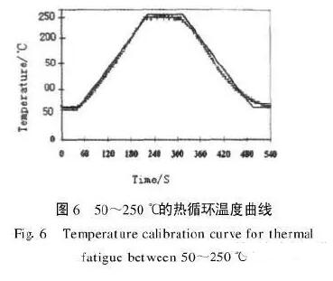 為了評估釬焊接頭的抗熱疲勞性能,需要進行熱循環(huán)測試。例如,對碳/碳復合材料與鋁合金20242T3膠結接頭的熱循環(huán)測試溫度范圍為50~250℃,一次熱循環(huán)包含五個階段:(1)50℃保溫30s;(2)用120s升溫到250℃;(3)250℃保溫60s;(4)用120s降溫到50℃;(5)50℃保溫30s。圖6為一個熱循環(huán)溫度曲線,其中,虛線所示為實際溫度曲線。