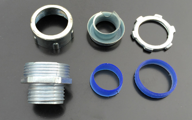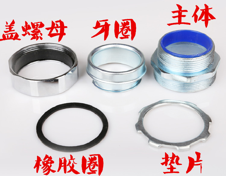 金屬軟管接頭細(xì)節(jié):蓋螺母、牙圈、主體、橡膠圈、墊片