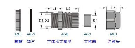| ※ | 若分開訂購(gòu)各零件時(shí),請(qǐng)?jiān)谛吞?hào)后面加上各代號(hào):螺帽(L) 墊片(W) 本體(B) 夾緊圈(S) 迫緊頭(N)例:訂購(gòu)AGJ-14螺帽,型號(hào)為AGJL-14。 | |