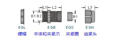 | ※ | 若分開訂購(gòu)各零件時(shí),請(qǐng)?jiān)谛吞?hào)后面加上各代號(hào):螺帽(L) 墊片(W) 本體(B) 夾緊圈(S) 迫緊頭(N)例:訂購(gòu)EG-7螺帽,型號(hào)為EGL-7。 |