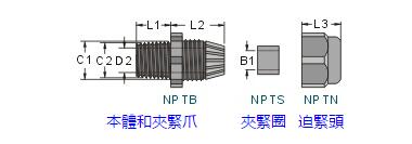 | ※ | 若分開訂購(gòu)各零件時(shí),請(qǐng)?jiān)谛吞?hào)后面加上各代號(hào):本體(B) 夾緊圈(S) 迫緊頭(N)例:訂購(gòu)NPT-14本體,型號(hào)為NPTB-14。 |